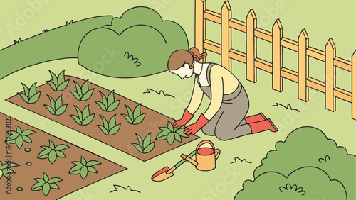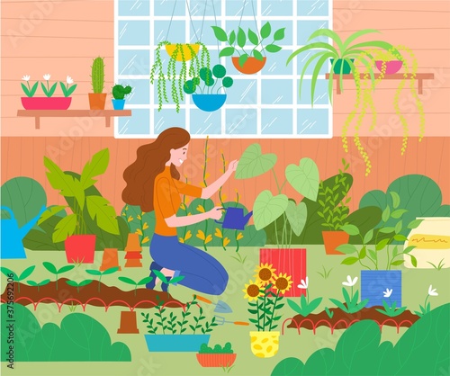 Фермерская семья работает на заднем дворе, ухаживая за растениями векторная иллюстрация. Любящие муж и жена садовник сажают цветы, обрезают деревья и кустарники в саду в сельской местности