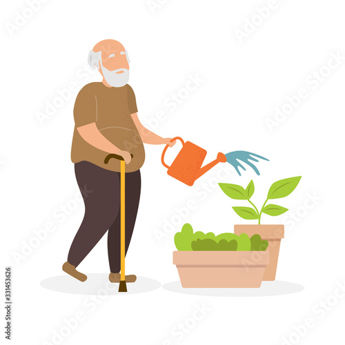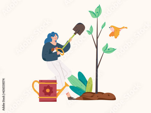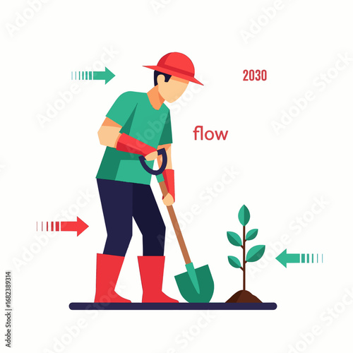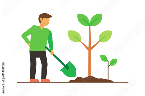 Фермер или садовник собирает картофель лопатой, плоская векторная иллюстрация. Сельское хозяйство, фермерство.