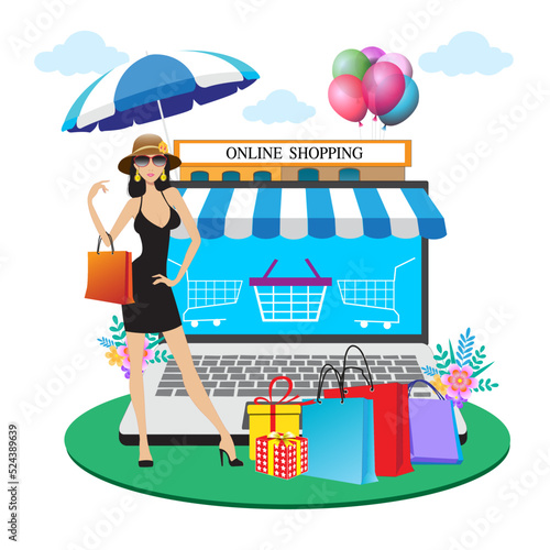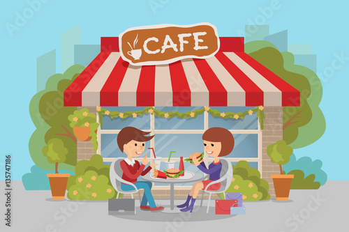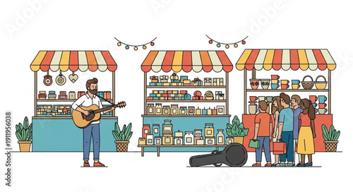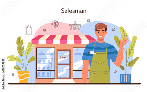 Фермер на местном рынке предлагает свежие овощи и продукты в уличном продуктовом ларьке. Фермерский рынок и магазин. Иллюстрация концепции. Векторный шаблон дизайна веб-сайта. Иллюстрация сайта целевой страницы.