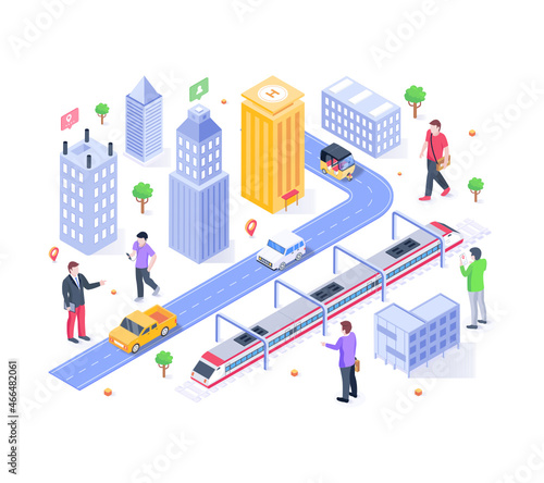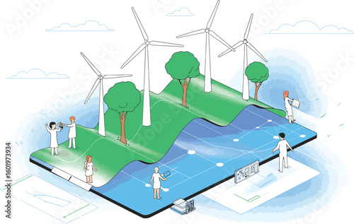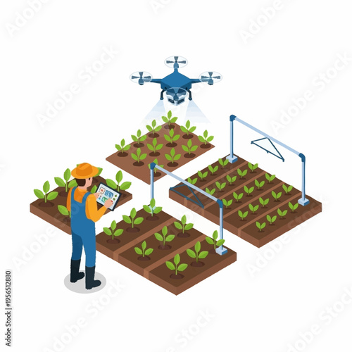 Фермер проводит анализ роста урожая в теплице с использованием робототехнических технологий, плоская векторная изометрическая иллюстрация. Интеллектуальная робототехника для тепличного садоводства. Разумное сельское хозяйство.