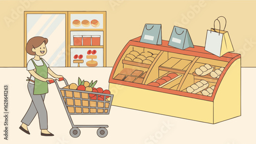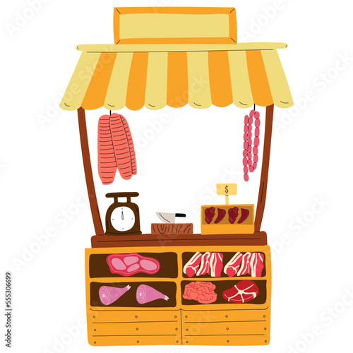 Киоск уличного рынка, продавщица, девушка, покупающая бананы и чистящие средства, мужчина, перемещающий тележку с виноградом, векторная иллюстрация. Базар, фруктовый и овощной фермерский рынок композиция для веб-баннера и т.д.