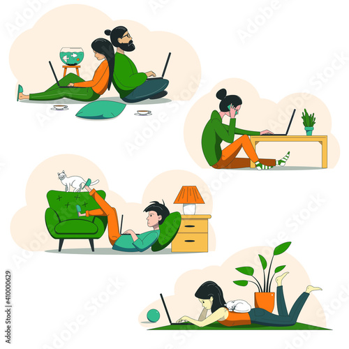 Набор плоских векторных сцен этапов производства фермерского кофе. Мужчина и женщина-фермер собирают, загружают в промышленную кофемолку, сушат и обжаривают кофейные зерна иллюстрация