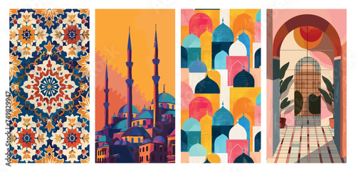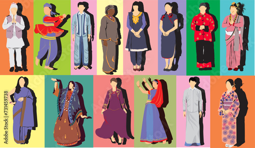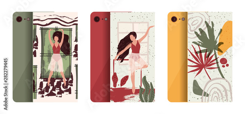 Векторная иллюстрация концепции показа мод. Нарисованный от руки набор постеров недели моды с моделями на подиуме подиума. Женщина в платье другого дизайна. Коллекция дизайна одежды.