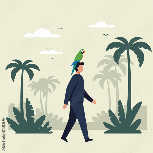 Векторная иллюстрация профессионального модельера мужского пола с девушкой-моделью, идущей по подиуму. Элемент дизайна концепции модного стилиста в плоском стиле