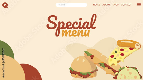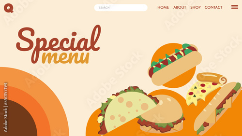 Набор для фаст-фуда. Плоский мультяшный классический американский бургер с сыром, ломтик пиццы, жареная куриная ножка и картофель фри, пластиковая бутылка газированного напитка, векторная иллюстрация десертов из маффинов и пирожных, выделенная на белом фоне