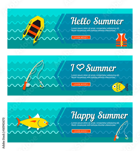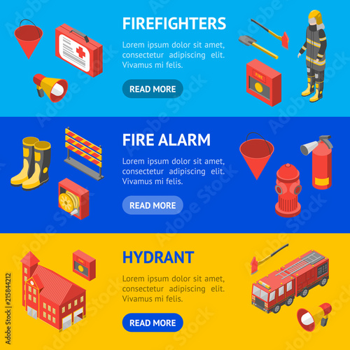 Векторный набор горизонтальных баннеров грузовиков быстрого питания. Изометрические значки рыбы, мороженого, коктейля и тележки для пончиков, место для текста.