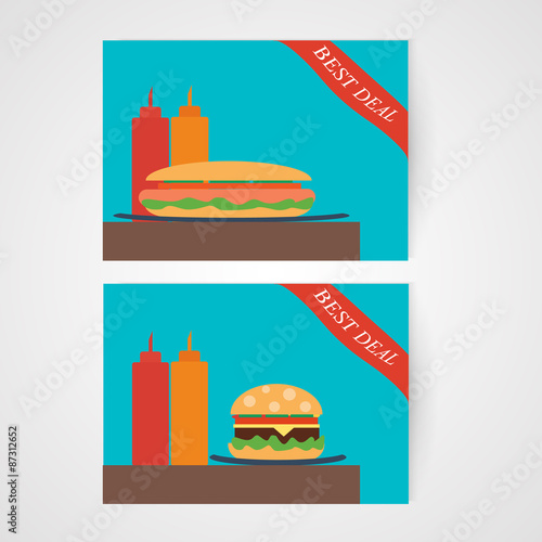 Иллюстрация дизайна векторного плоского стиля фаст-фуда. Хот-дог, чизбургер, пончик, картофель фри, безалкогольные напитки, бутылки с кетчупом и горчицей, открытая вывеска. Композиция быстрого питания для веб-баннера, страницы веб-сайта.