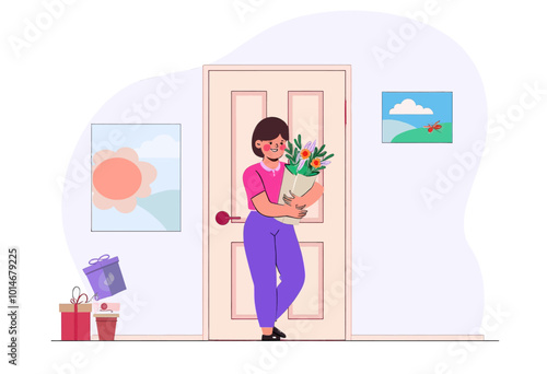 Толстая женщина делает покупки в мультяшном векторе магазина. Концепция бодипозитива и моды для женщин с избыточным весом. Покупатель и продавец в магазине-бутике