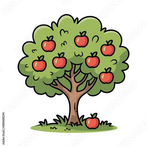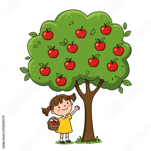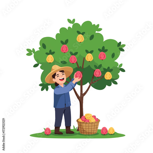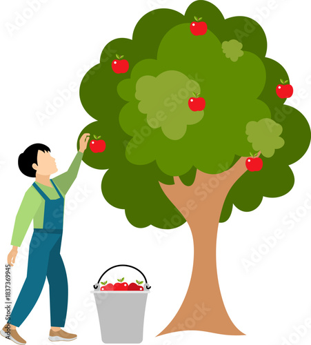 Отец и маленький сын собирают плоды яблони с векторной иконки дерева, изолированной на белом фоне.