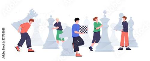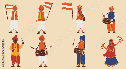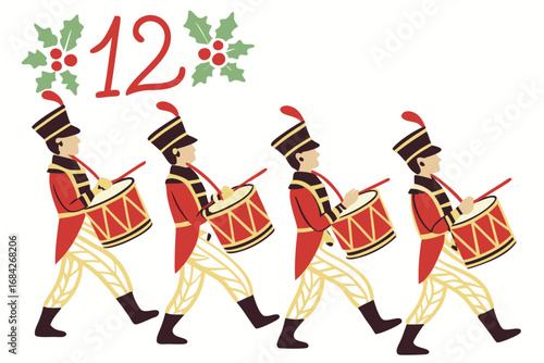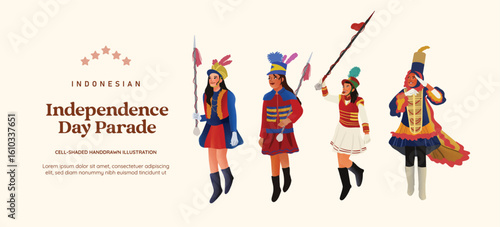Векторная иллюстрация марша женского оркестра для взрослых и детей. Симпатичная марширующая молодая женщина и дети в красной униформе, играющие на музыкальном инструменте, изолированные на белом фоне