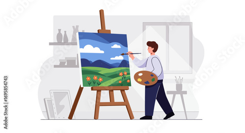 Женщина - художник рисует на мольберте. Пейзажный рисунок в блокноте цветными карандашами. Иллюстрация концепции арт-студии. Векторный шаблон дизайна веб-сайта. Иллюстрация сайта целевой страницы.