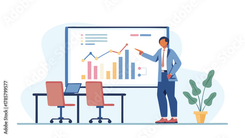 Женщина-босс-лидер, стоящая на вершине столбчатой диаграммы, и мужчина-сотрудник, падающий с нее, плоская векторная иллюстрация. Концепция феминизма.