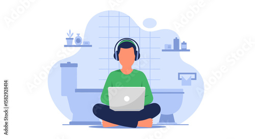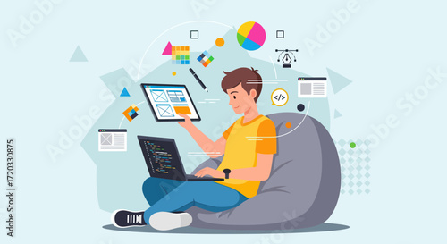 Женщина-графический дизайнер, переживающая творческий кризис или блок, плоская векторная иллюстрация. Женщина спит, сидя за столом перед ноутбуком. Творческий кризис, тревога, усталость, головная боль, депрессия.