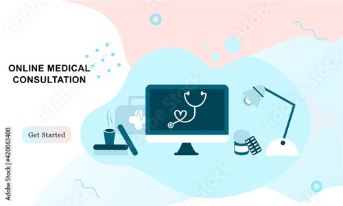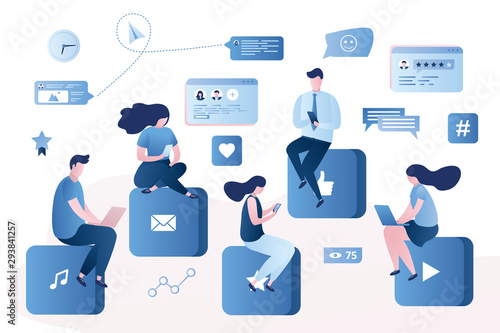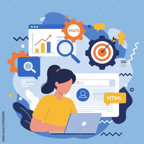 Женщина-графический дизайнер, переживающая творческий кризис или блочную плоскую векторную иллюстрацию. Женщина спит, сидя за столом перед ноутбуком. Творческий кризис, беспокойство, усталость, головная боль, депрессия.