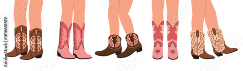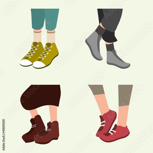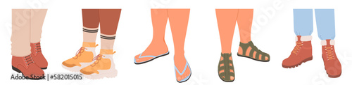 Женская обувь разных типов векторная иллюстрация. Модная повседневная, стильная элегантная гламурная и официальная обувь на женской ноге, выделенная на белом фоне