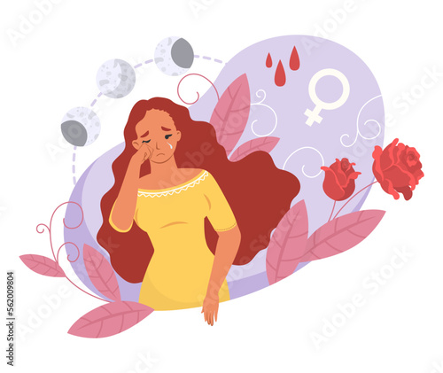Векторная сцена женского здоровья и периода менструации. Изолированный набор с женщиной, страдающей от предменструального синдрома и болей в животе, маткой и предметами первой помощи во время месячных кровотечений