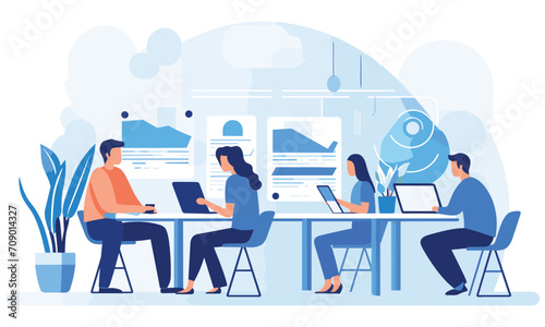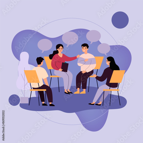 Встреча женских персонажей. Пациенты, испытывающие проблемы, сидят в кругу и разговаривают, плоская векторная иллюстрация. Групповая терапия, консультирование, психологическая помощь, групповая поддержка.