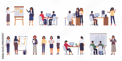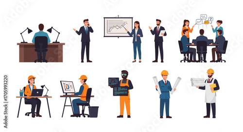 Векторный набор съемочной группы. Киностудия кинопроизводства, кинорежиссер, работник дизайна, иллюстрация медиаиндустрии. Режиссер, оператор, ведущий, стилист, визажист персонаж, выделенный на белом фоне