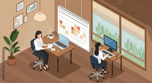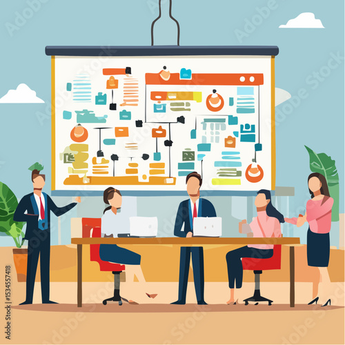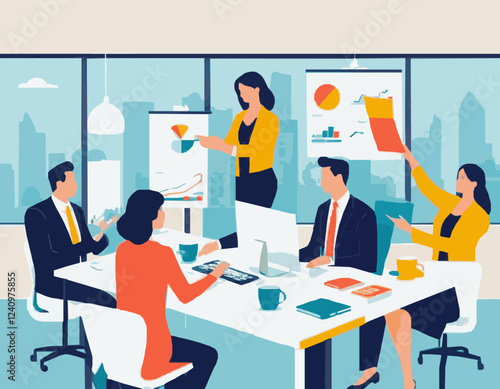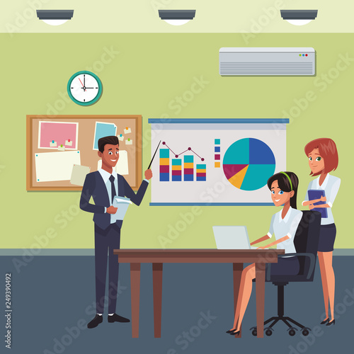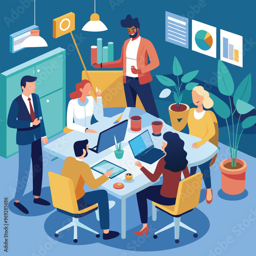 Векторная изометрическая иллюстрация многоэтнической группы офисных работников, уволенных с работы работодателем, указывающим им на дверь.