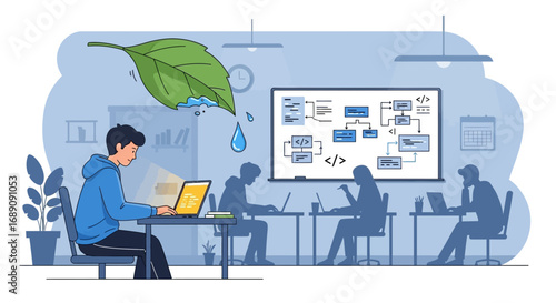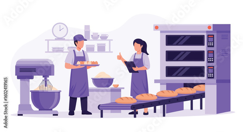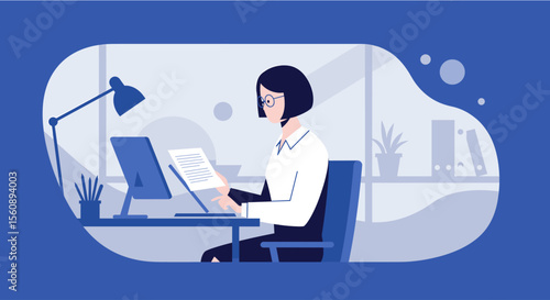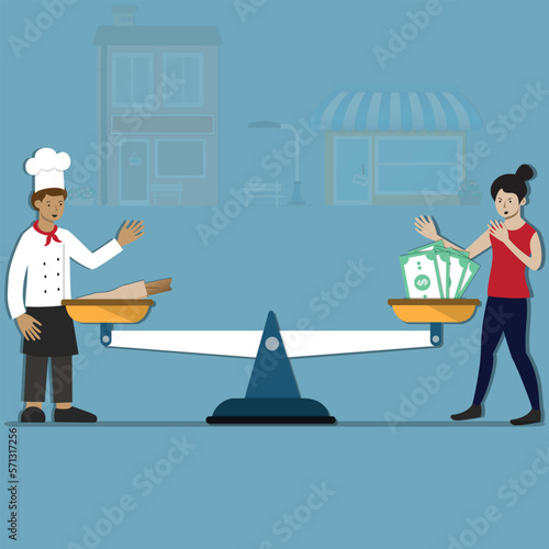 Рыбный магазин, плоская векторная иллюстрация. Продавщица стоит у витрины холодильника со свежей и консервированной рыбой. Рыбная лавка, рынок. Супермаркет, продуктовый магазин, секция морепродуктов, отдел.