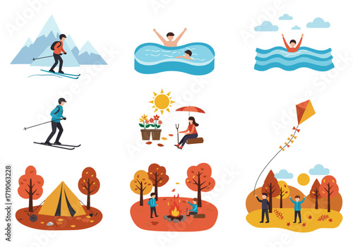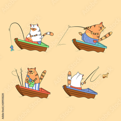Рыбак, сидящий в лодке, на берегу реки, в воде или возле проруби векторная иллюстрация. Изолированный набор для сезонной рыбалки с мультяшными персонажами. Концепция мужского хобби