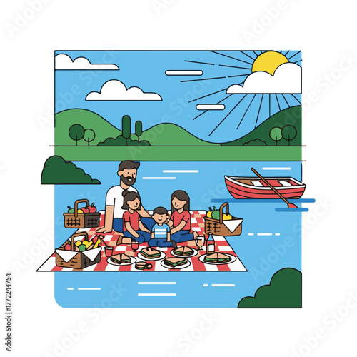 Сцена рыбалки с человеком, ловящим рыбу на надувной лодке или на берегу реки векторная иллюстрация. Хобби на свежем воздухе, досуг для рыбаков в выходные дни