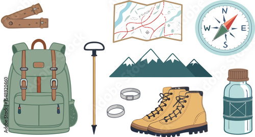 Иллюстрация дизайна векторного плоского стиля рыбалки. Резиновая лодка, рыболовные ботинки, удочка, поплавок, рыба, ведро и червяк-приманка. Композиция рыболовных снастей и принадлежностей для веб-баннера, страницы веб-сайта и т.д.