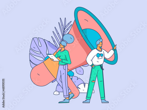 Фотограф фотографирует микро-рыбака с огромной рыбой на крючке, векторная иллюстрация. Хобби рыбалки, спортивный турнир, концепция летнего активного отдыха на открытом воздухе для веб-баннера, страницы веб-сайта и т.д.