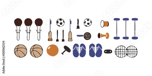 Фитнес и тренировки в тренажерном зале. Векторный набор значков тренажерного зала в плоском стиле, изолированных на белом фоне. Тренажеры, гантели, гантели, беговая дорожка, мяч.