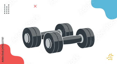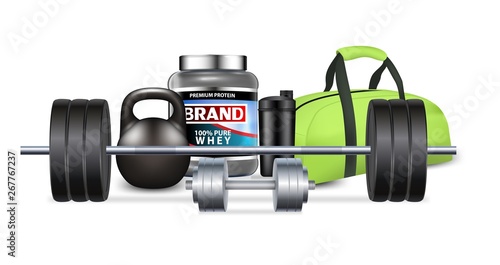 Оборудование для фитнес-зала и спортивное питание векторная реалистичная иллюстрация. Весы, гантели, гири, штанга, пакет, сывороточный протеин. Тренировка по тяжелой атлетике, пауэрлифтингу или бодибилдингу для наращивания мышечной массы.