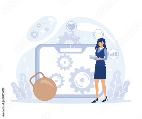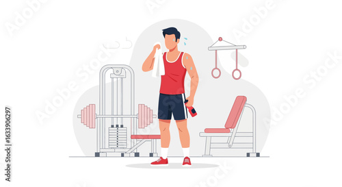 Фитнес-зал. Молодой человек-культурист, выполняющий упражнения с отягощениями для рук с гантелями, плоская векторная иллюстрация. Тренировка рук для бицепсов и трицепсов, бодибилдинг. Спорт и здоровый образ жизни.