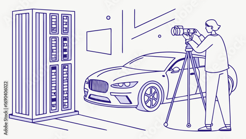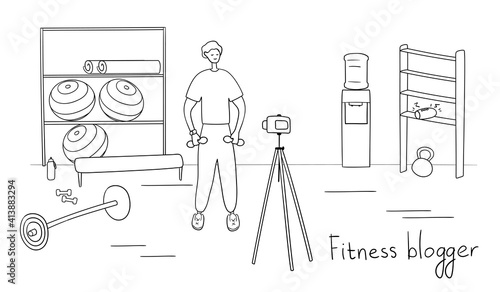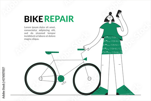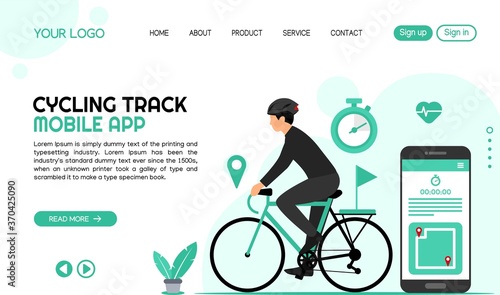 Векторная плоская иллюстрация большого смартфона с приложением для отслеживания фитнес-активности и крошечного персонажа-велосипедиста с велосипедом. Фитнес-трекер, концепция смарт-спортивной технологии для веб-баннера, страницы веб-сайта.
