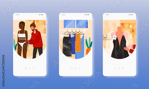 Примерочная. Индустрия моды, шоу-бизнес. Гардеробная. Экраны для мобильных приложений. Векторный шаблон баннера для разработки веб-сайтов и мобильных устройств. Иллюстрация дизайна веб-сайта и пользовательского интерфейса.