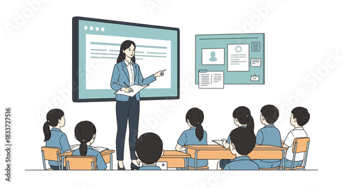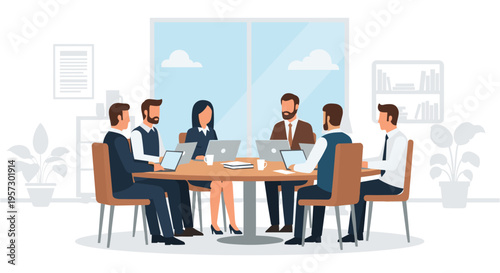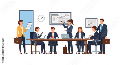 Плоский дизайн деловых людей или офисных работников. Люди разговаривают и работают за компьютерами. Деловая презентация и встреча. Векторная иллюстрация, изолированная на белом фоне.