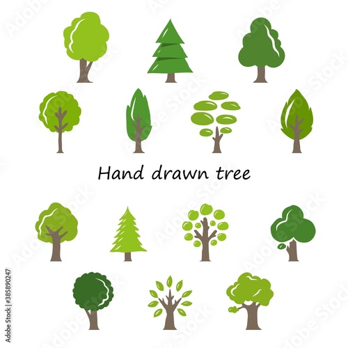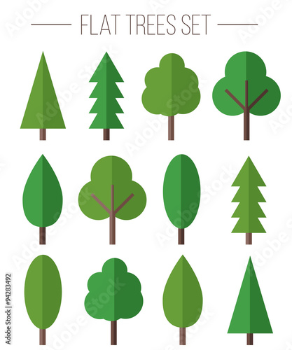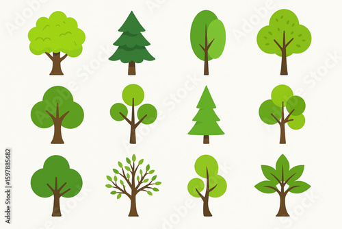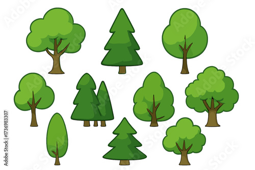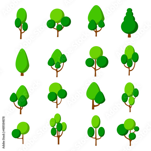Плоское дерево, расположенное изолированно на белом фоне. Векторная коллекция элементов дизайна для игр, мультфильмов, иллюстраций.