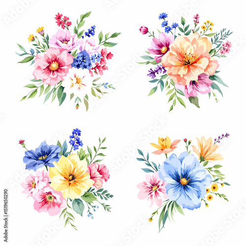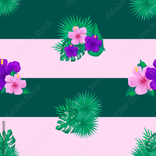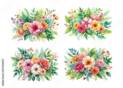 Набор цветочных тропических композиций, векторная изолированная иллюстрация. Букеты из вырезанной из бумаги монстеры, пальмовых листьев, гибискуса, франжипани, цветов орхидеи. Экзотические цветы и растения для приглашения на вечеринку, открытки.