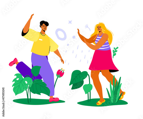 Мужские и женские персонажи делают букет цветов, векторная иллюстрация. Цветочный магазин, концепция оформления цветов для веб-баннера, страницы веб-сайта и т.д.