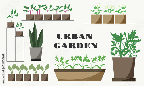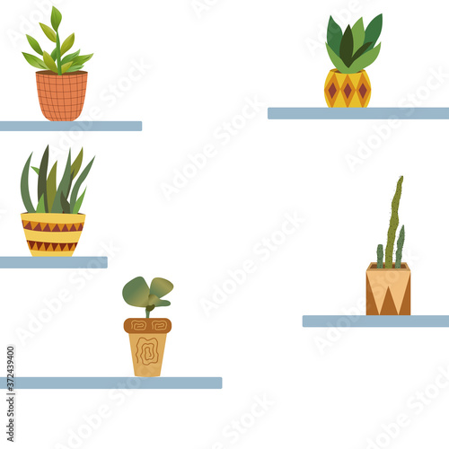 Цветочные горшки и фоторамка на полке векторный значок, изолированный на белом фоне