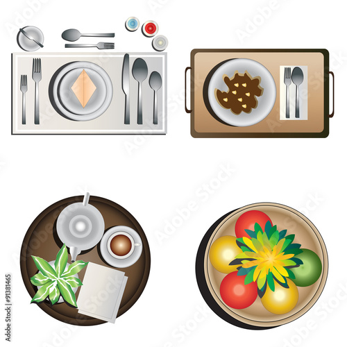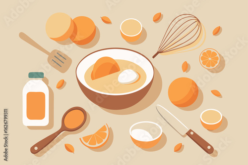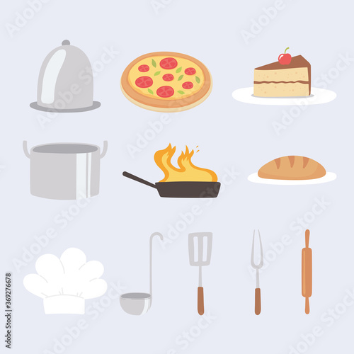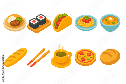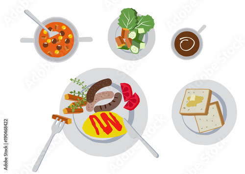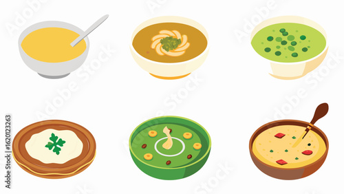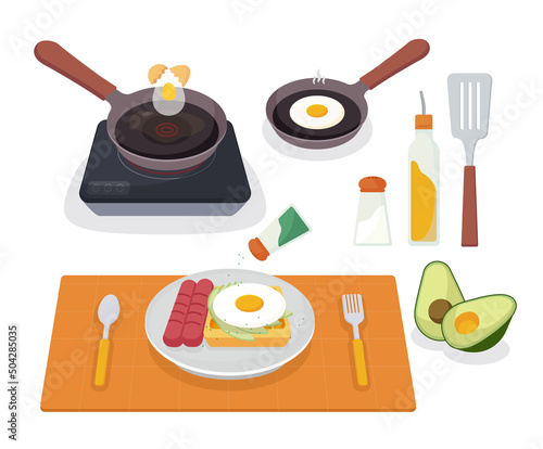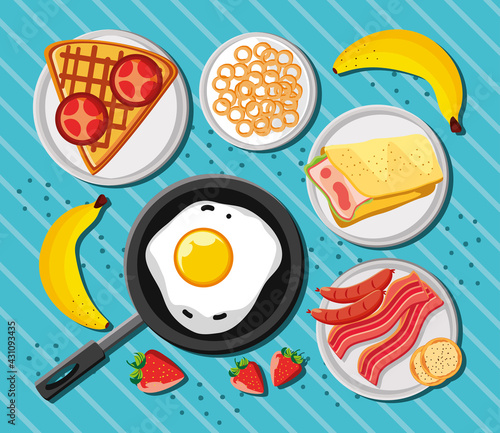 Пышные блины с различными начинками из меда, шоколада, черники и клубничных фруктов, векторная изолированная иллюстрация. Реалистичная сковорода с блинчиком, кофе. Традиционная американская еда на завтрак.