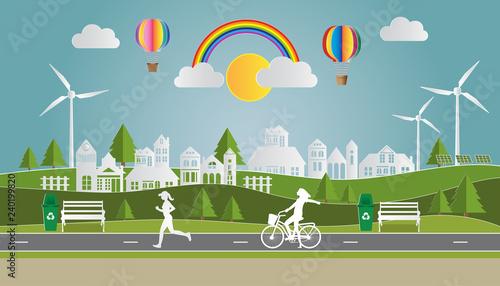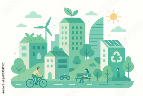 Векторная иллюстрация велосипедного курьера, доставляющего картонную коробку с фаст-фудом на велосипеде, и курьера, идущего по улице с красной сумкой для доставки. Концепция доставки еды с элементами дизайна в плоском стиле.