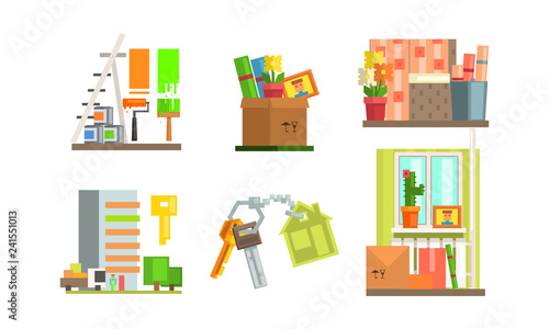 Набор для доставки еды, плоская векторная изолированная иллюстрация. Люди заказывают, шеф-повар готовит, а курьер доставляет фаст-фуд, пиццу, продукты. Онлайн-заказ еды. Безопасная бесконтактная служба доставки.
