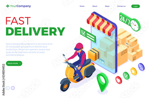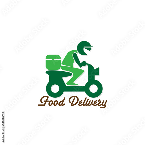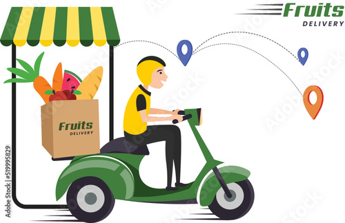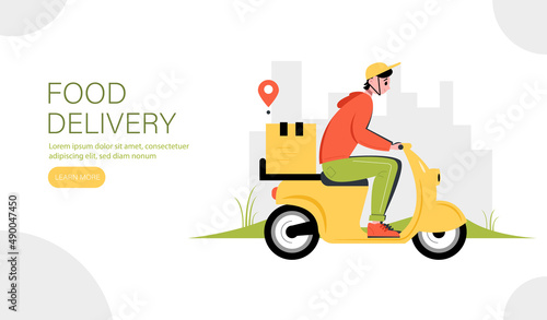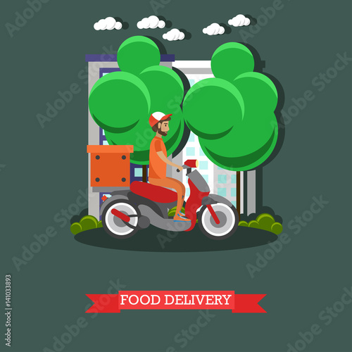 Векторная иллюстрация курьера, едущего на скутере. Курьер доставки, доставляющий еду на мотоцикле, элемент дизайна в плоском стиле.