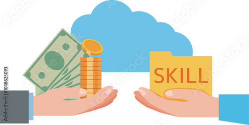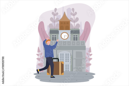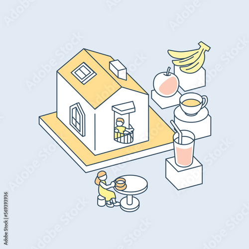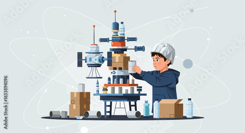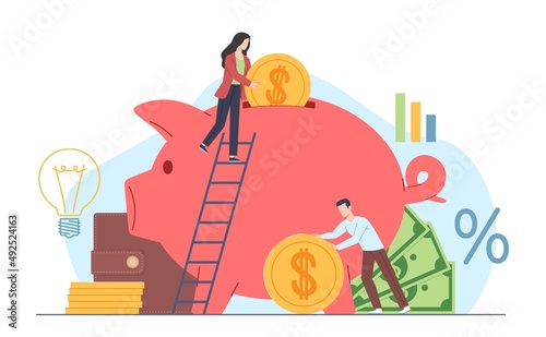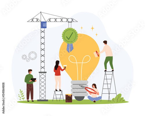 Коробка для пожертвований продуктов питания, векторная плоская иллюстрация. Волонтеры, крошечные персонажи мужского и женского пола, упаковывают продукты для бездомных и бедных людей. Гуманитарная помощь, продовольственная кампания, пожертвования и благотворительность, волонтерство.