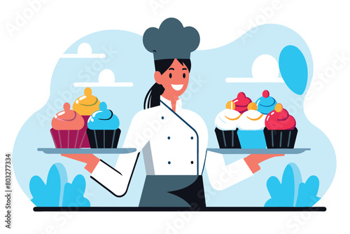 Плакат о безопасности пищевых продуктов со счастливым персонажем мужского пола-шеф-поваром в униформе среди векторных иллюстраций здоровых натуральных фруктов и овощей. Концепция обработки высококачественных продуктов питания