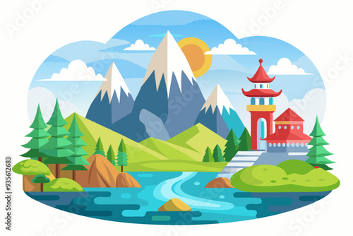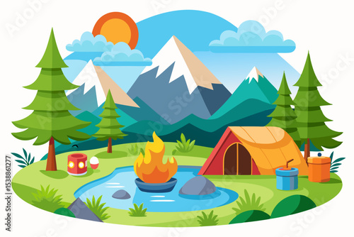 Летний лесной кемпинг на заднем плане в стиле бумажного искусства. Лагерь на реке с 3d-векторным дизайном поверх горного баннера. Туристический плакат. Приключение на природе