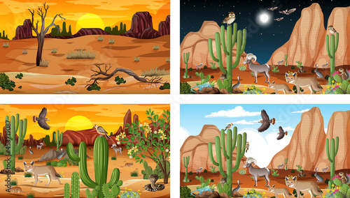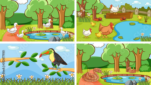 Сцена лесного пожара. Испуганные бегущие животные, сгоревшие деревья и пожарный, пытающийся остановить вспышку пламени. Концепция стихийного бедствия природного или техногенного характера