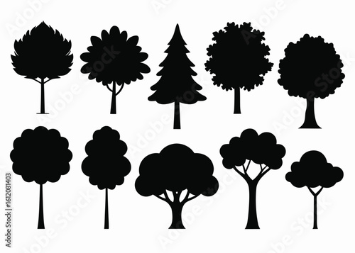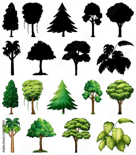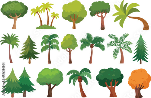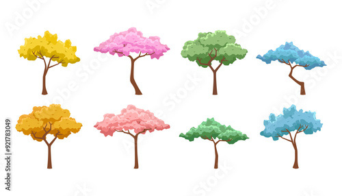 Набор деревьев и кустарников, плоская векторная изолированная иллюстрация. Лесные, садовые деревья, кустарники, покрытые зелеными, желтыми, красными листьями и лишенные их листвы.