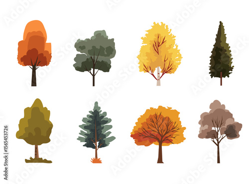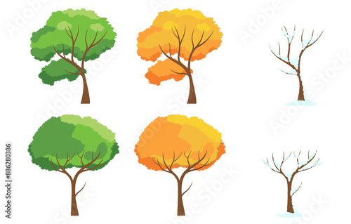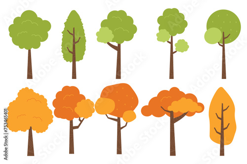 Набор деревьев и кустарников, плоская векторная изолированная иллюстрация. Лесные, садовые деревья, кустарники, покрытые зелеными, желтыми, красными листьями и лишенные листвы.