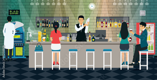 Векторная иллюстрация эпизода из фильма ужасов "Франкенштейн", основанного на готическом романе Мэри Шелли. Интерьер кафе-кинотеатра. Элементы дизайна в плоском стиле.