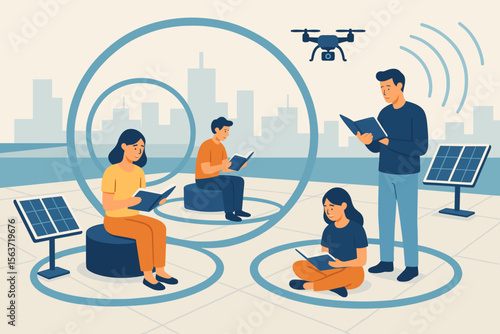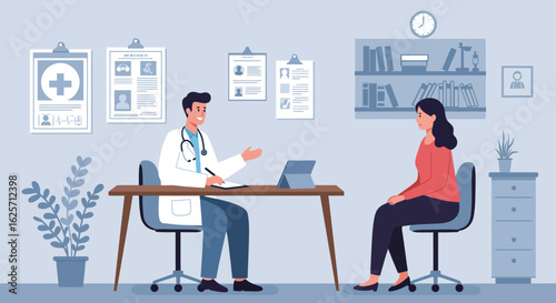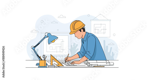 Внештатный. Молодой человек, работающий в домашнем офисе, сидя за столом, плоская векторная иллюстрация. Мужской персонаж-фрилансер в наушниках работает на ноутбуке в уютной гостиной. Удаленная работа, онлайн-обучение.
